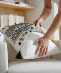 Create a calm, textured foundation for your space with this cream-colored boho pillow cover, designed to elevate your decor with subtle charm and playful detail. The neutral base provides a clean and versatile canvas, while the multicolor pom-poms — featuring mustard yellow, dusty blue, and black — add just the right touch of personality.