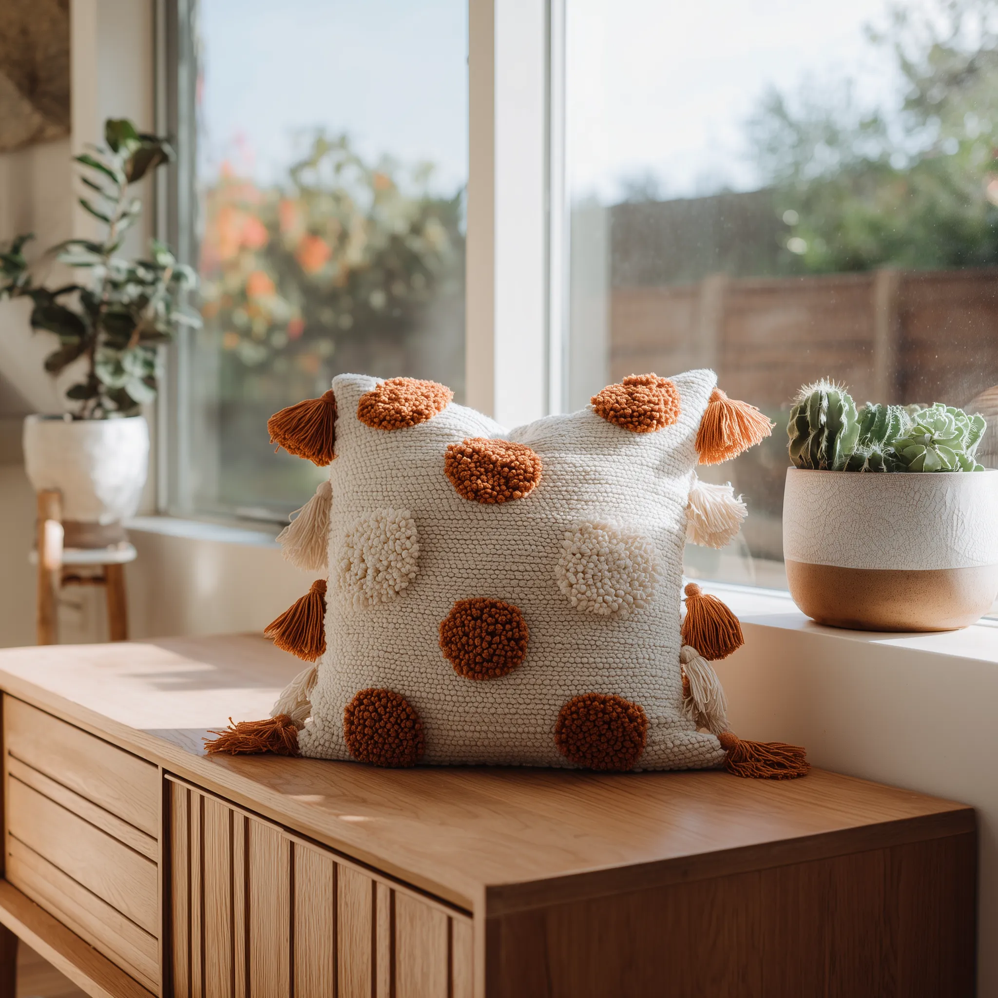 Add playful texture and cozy charm to your home with this boho-inspired pillow cover. Featuring a soft white cotton weave with oversized terracotta pom-pom accents, this cover brings warmth and a handcrafted aesthetic to any space. The tassels on each corner enhance its visual appeal, making it a stylish choice for sofas, beds, or lounge chairs.