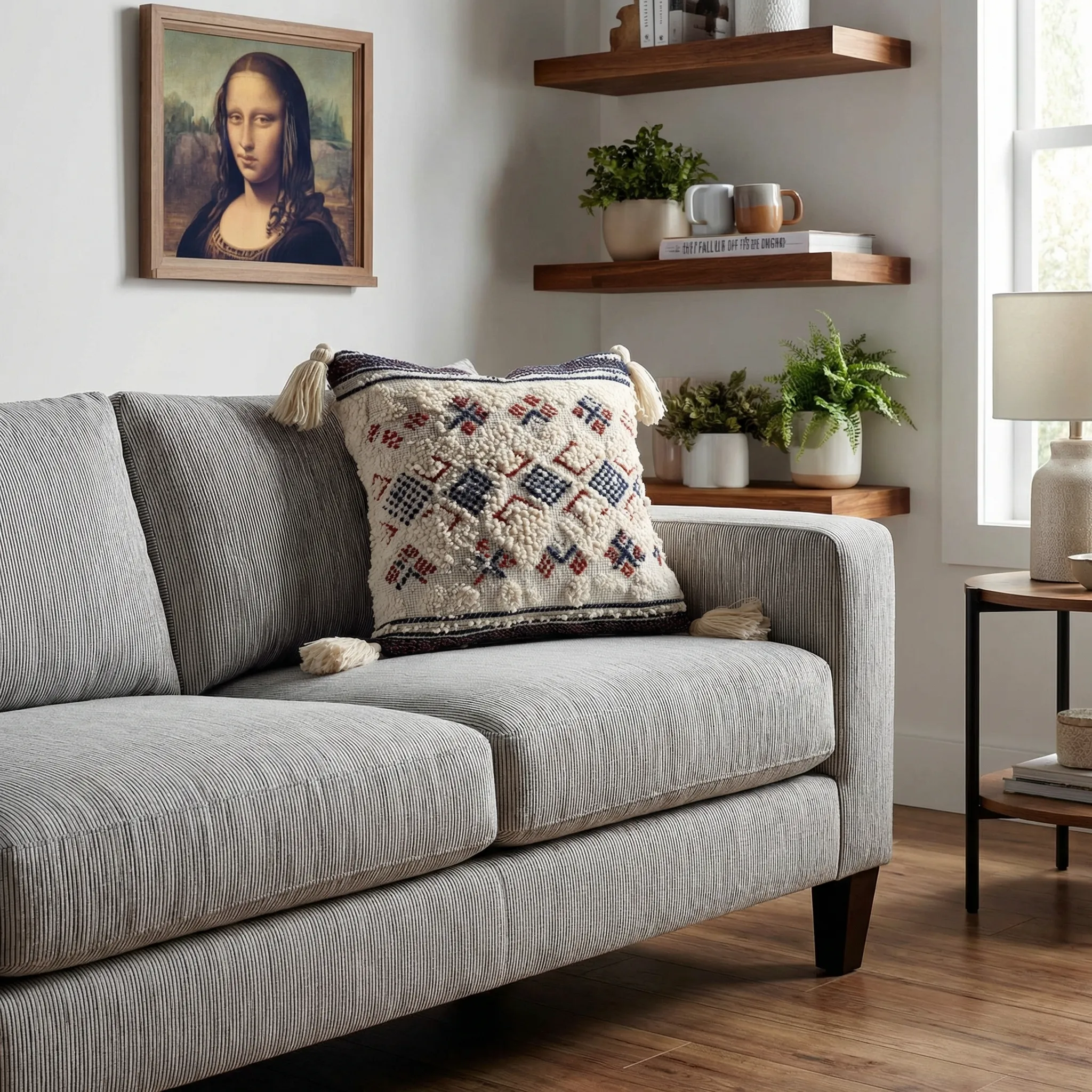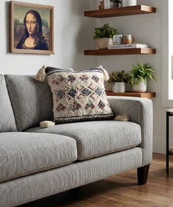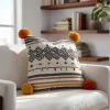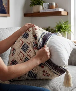 Textured boho pillow cover with off-white woven base, burgundy and navy diamond embroidery, and cream tassels. Insert not included.