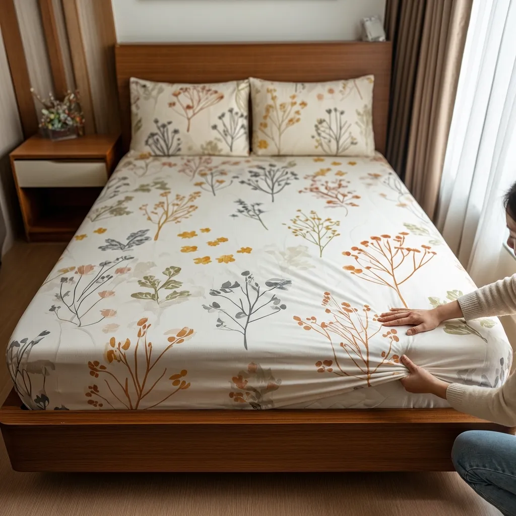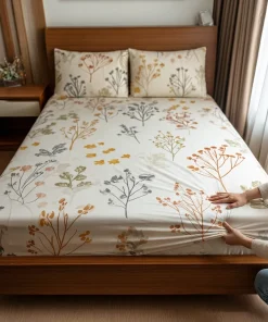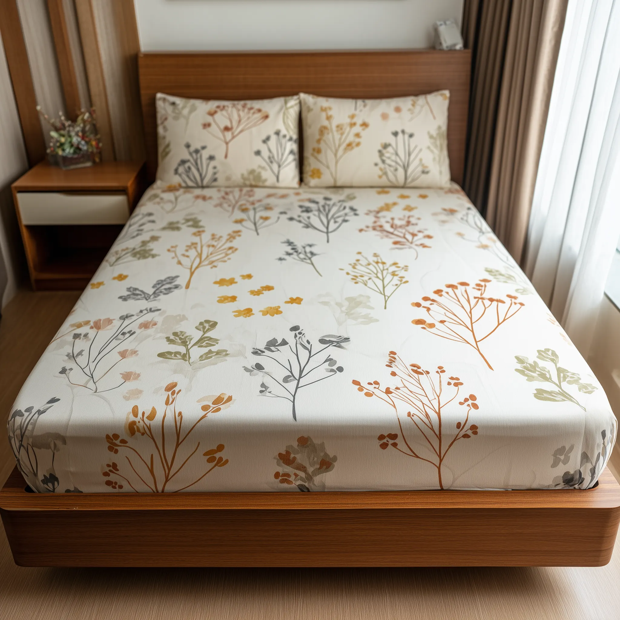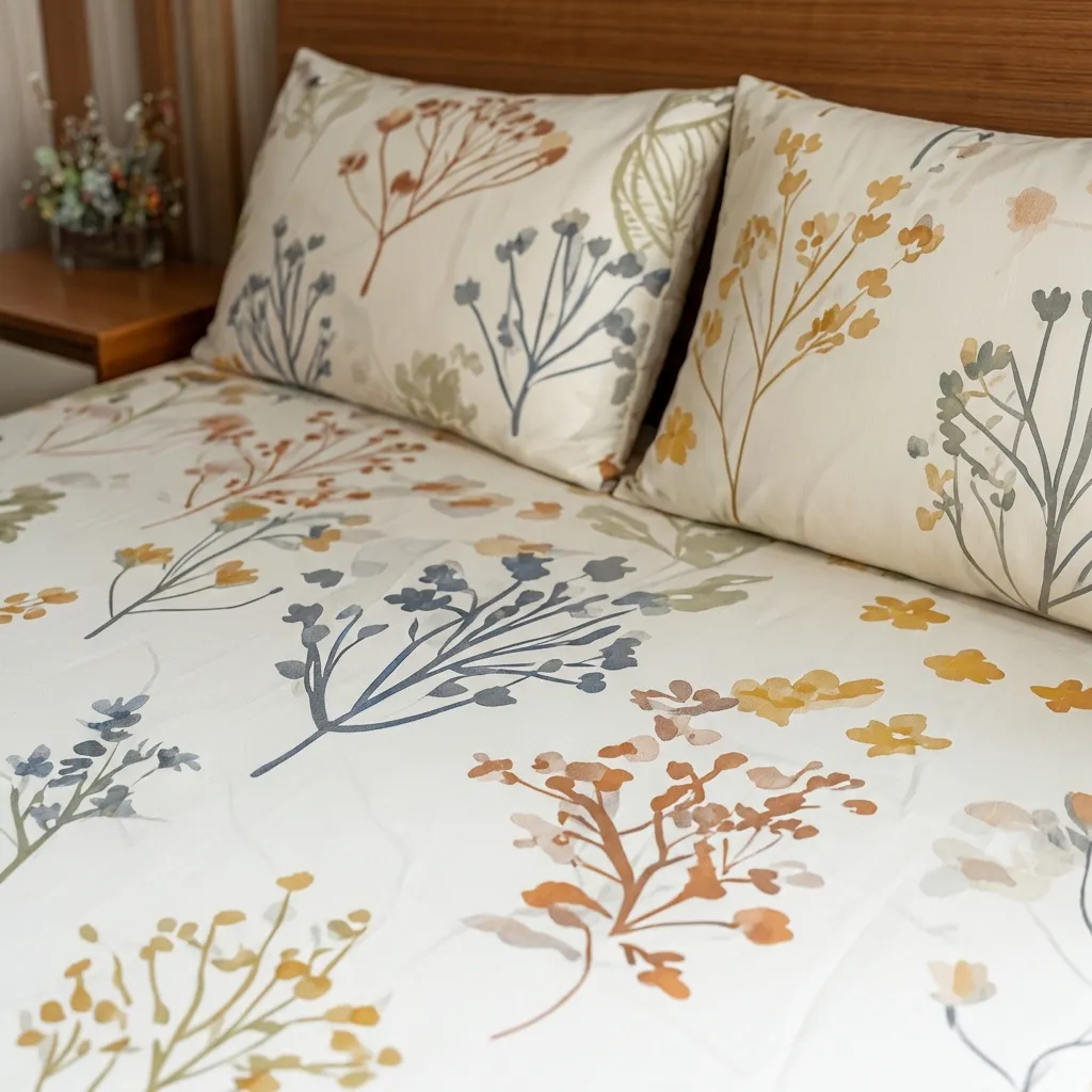 Cream flat sheet set with botanical floral print. Soft polyester fabric with matching pillowcases. Perfect for cozy, nature-inspired interiors.