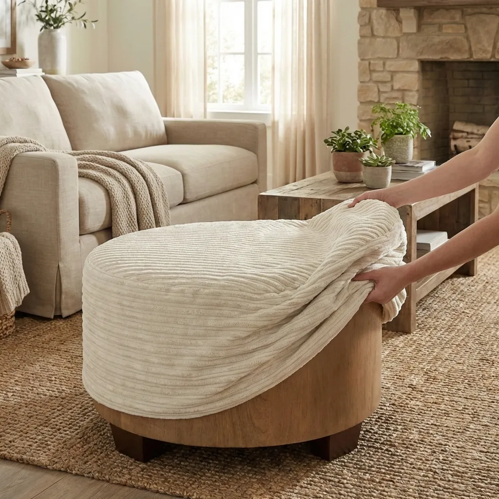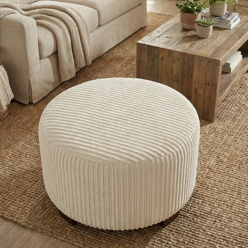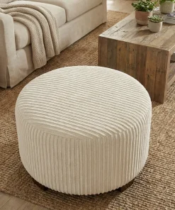 This fabric pouf ottoman features a rounded, generously proportioned form wrapped in ribbed fabric upholstery that introduces subtle texture and visual rhythm. The fabric surface offers a smooth, inviting feel while maintaining a clean and structured appearance suitable for regular use in living areas.