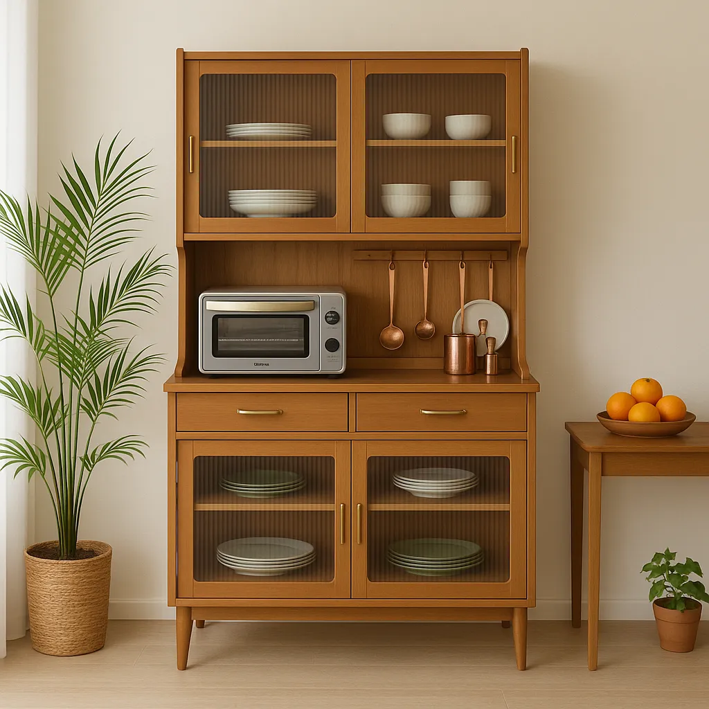 Upgrade a culinary space using this versatile kitchen storage cabinet designed for both visual balance and everyday function. The structure includes an upper compartment and a lower compartment featuring ribbed glass panel that supports display while keeping content covered. A central open zone accommodates a small appliance such as a microwave or toaster oven. Built in hook offers access to a utensil or cookware item. Two smooth glide drawer provide added space for cutlery, linen or accessory. The balanced design fits within a modern, minimalist or transitional kitchen setting. Suitable for those who prefer efficiency and visual order, this kitchen storage cabinet provides enclosed storage and a clean form in one functional piece.