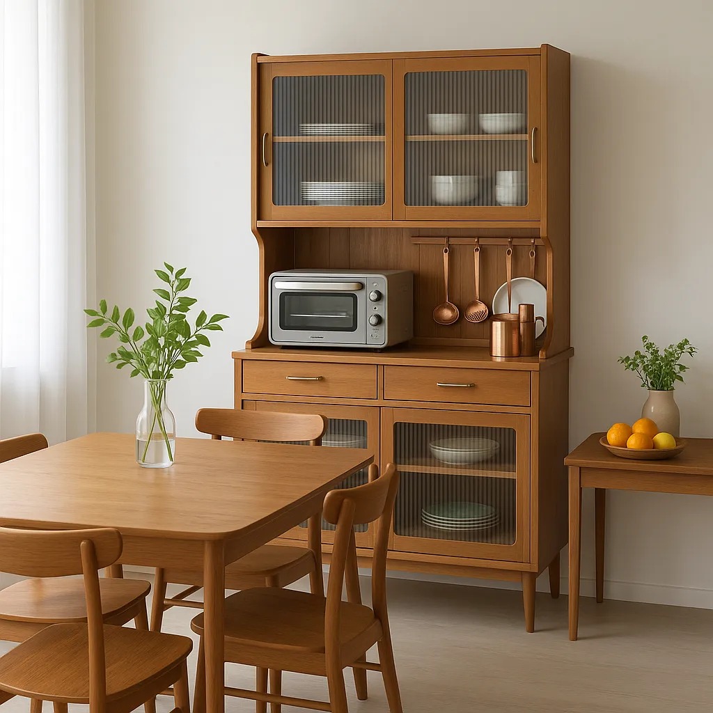 Elegant kitchen cabinet offers smart storage with ribbed glass door, open space for appliance, drawer, and hook perfect for modern, minimalist kitchen.