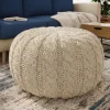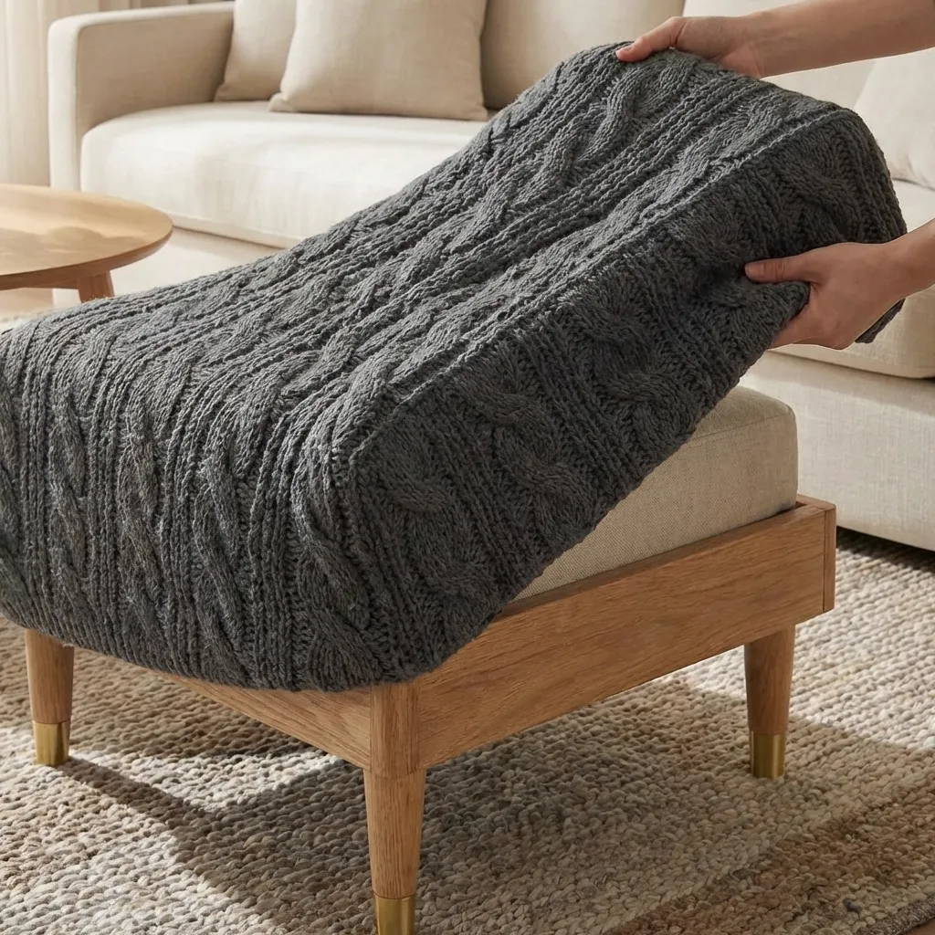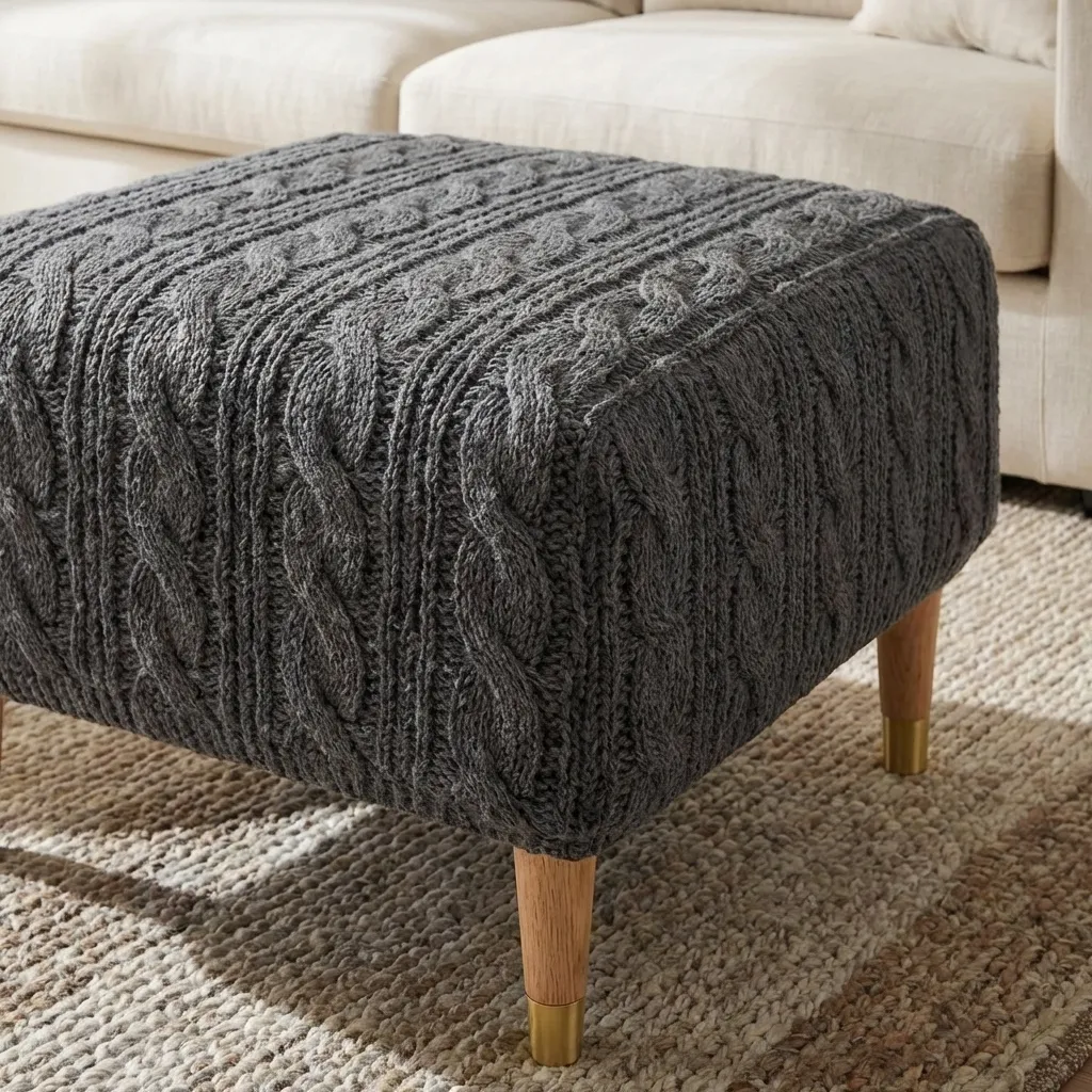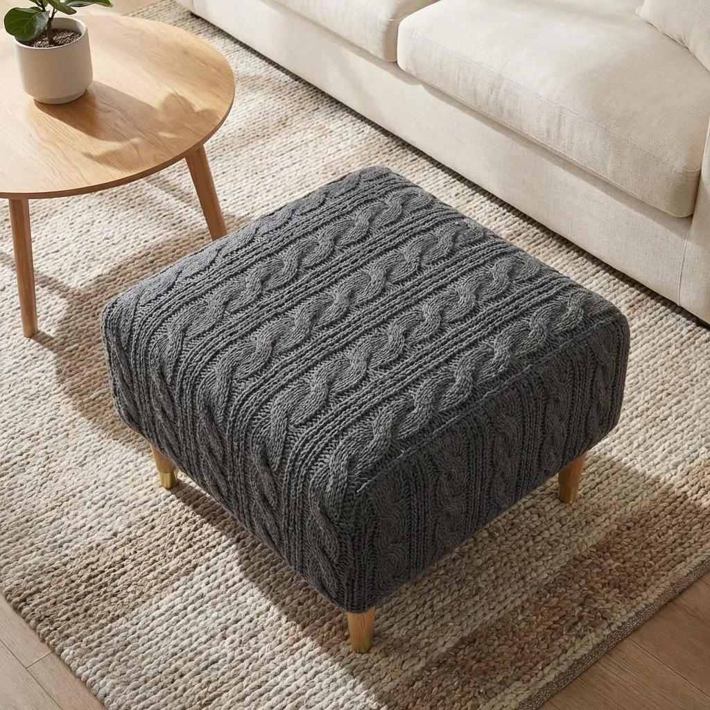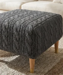 A soft knitted ottoman cover featuring a classic cable texture, designed to refresh the look of your ottoman and add visual warmth to living spaces – cover only.