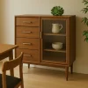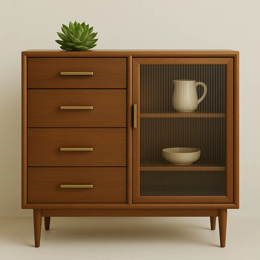 Optimize a dining or kitchen area with this small kitchen cabinet offering a balanced mix of storage and display. Designed for a compact space, the piece features four smooth drawer ideal for storing utensil, napkin, or kitchen tool. A ribbed glass door on the side reveals an open shelf suited for dish, jar, or decorative item. Clean edge and elevated leg give the cabinet a modern, uncluttered feel while enhancing accessibility. Whether placed beside a dining table or in a breakfast nook, this cabinet adds storage capacity without overwhelming the space. Its simple silhouette and subtle detail make it a stylish solution for a minimalist interior.